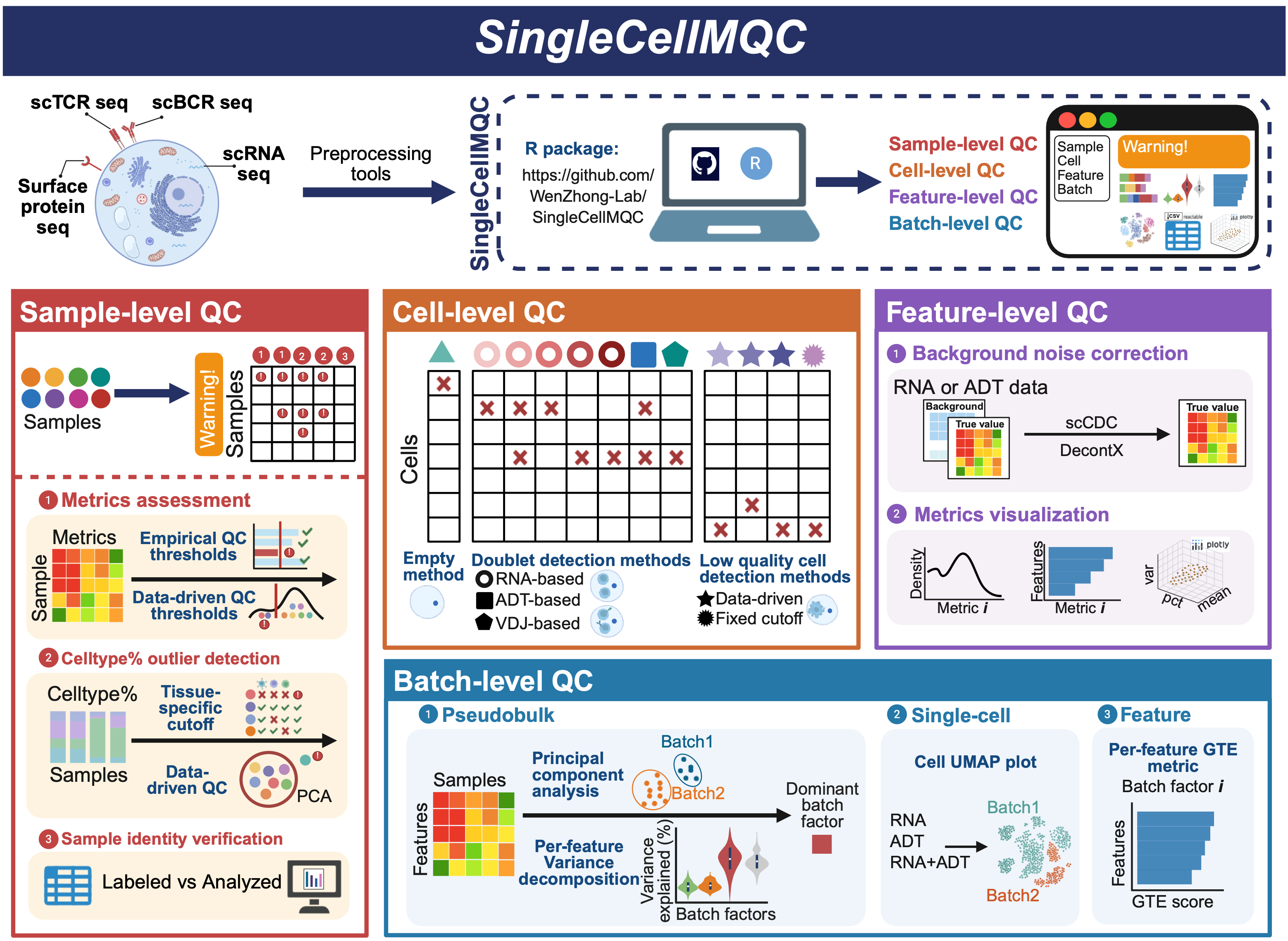 SingleCellMQC: A comprehensive quality control workflow for single-cell single omics or multi-omics. The SingleCellMQC workflow consists of four major QC modules: sample-level QC, cell-level QC, feature-level QC, and batch-level QC. All functions within the SingleCellMQC package are built upon the Seurat and BPCells frameworks and are compatiable with commonly used single-cell analysis pipelines. Each QC module can be executed independently, allowing users to perform QC tasks for specific aims. Moreover, interactive HTML reports summarizing QC results can be generated via the ‘RunReport’ function. In addition, the workflow is optimized for large-scale datasets, and all QC tasks can be executed on a standard laptop without requiring high-performance computing.